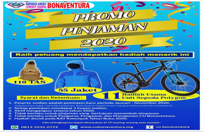 CU Bonaventura kembali mengadakan Promo Pinjaman dengan hadiah yang keren pastinya. Bagi anggota yang meminjam selama periode Januari sampai November 2020 raih kesempatan mendapat hadiah berupa tas, jaket, atau sepeda. Syarat-syarat untuk mengikuti promo pinjaman sebagai berikut...